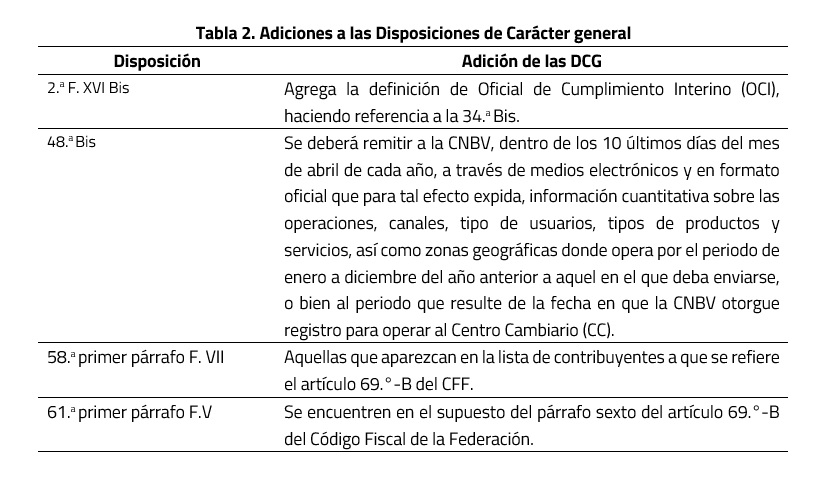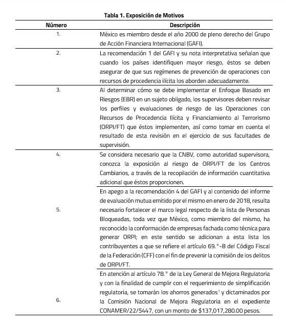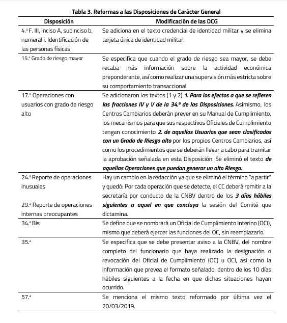 El presente boletín tiene como objetivo presentar las recientes modificaciones efectuadas a las Disposiciones de Carácter General (DCG) publicadas en el Diario Oficial de la Federación (DOF) el 19 de enero de 2023, aplicables a los Centros Cambiarios e incluidas en el artículo 95.° Bis de la Ley General de Organizaciones y Actividades Auxiliares del Crédito (LGOAAC). 1. IntroducciónSegún la Comisión Nacional Bancaria y de Valores (CNBV, 2016), se denomina “Centro Cambiario” a: Las sociedades anónimas organizadas de conformidad con lo dispuesto en la Ley General de Sociedades Mercantiles, y que realicen de forma habitual y profesional, compra venta de billetes, piezas acuñadas y metales comunes, con curso legal en el país de emisión, de cheques de viajero, de piezas metálicas acuñadas en forma de moneda y de documentos a la vista denominados y pagaderos en moneda extranjera, en los términos a que se refiere el artículo 81-A de la Ley General de Organizaciones y Actividades Auxiliares del Crédito.Como señalé en Los Centros Cambiarios (2018), de mi autoría, en el contexto de los Centros Cambiarios, en el año 2011 se reforma el artículo 81.°-A de la LGOAAC: Estableciéndose que, la compra – venta de divisas se podrá realizar únicamente por personas morales organizadas conforme a la Ley General de Sociedades Mercantiles (LGSM) y registradas como centro cambiario ante la CNBV, este organismo el 10 de Abril de 2012 emite las disposiciones de carácter general en materia de PLD, mismas que constituyen la normativa vigente para estas empresas de servicios monetarios.A partir del 2012, las DCG aplicables a estos Organismos Auxiliares del Crédito han tenido diversas modificaciones, todas enfocadas a cumplir con las observaciones emitidas por las evaluaciones mutuas realizadas por el Grupo de Acción Financiera Internacional (GAFI) con apego a las 40 Recomendaciones. Algunas de estas reformas en materia presentan la siguiente secuencia cronológica: 4 de abril de 2014 (DCG para la obtención del dictamen técnico) 2 de octubre de 2014 (DCG para la certificación de auditores y oficiales de cumplimiento) 31 de diciembre de 2014 (Reforma a las DCG en materia de Prevención de Lavado de Dinero y Financiamiento al Terrorismo (PLD/FT) 13 de marzo de 2015 (Modificación a las DCG en materia de Certificación) 29 de diciembre de 2015 (Reforma a las DCG en materia de PLD/FT) 30 de septiembre de 2016 (Resolución que modifica la DCG para la obtención del dictamen técnico) 9 de marzo de 2017 (Reforma a las DCG en materia de PLD/FT) 20 de marzo de 2019 (Reforma a las DCG en materia de PLD/FT) El pasado 19 de enero de 2023 se publicó en el DOF la resolución que reforma y adiciona diversas modificaciones a las Disposiciones de Carácter General a que se refiere el artículo 95.° Bis de la LG0AAC aplicables a los Centros Cambiarios a que se refiere el artículo 81°-A del mismo ordenamiento (DOF,2023), mismas que con fecha 01/02/2023 presentaron aclaraciones de redacción. Por lo tanto, el presente boletín tiene como objetivo presentar de forma práctica y esquemática las modificaciones realizadas a las mismas. 2. DesarrolloLos motivos por los cuales la autoridad fundamenta las modificaciones realizadas a las DGC contenidas en el artículo 95.°-Bis de la LGOAAC, se resumen en la siguiente tabla: