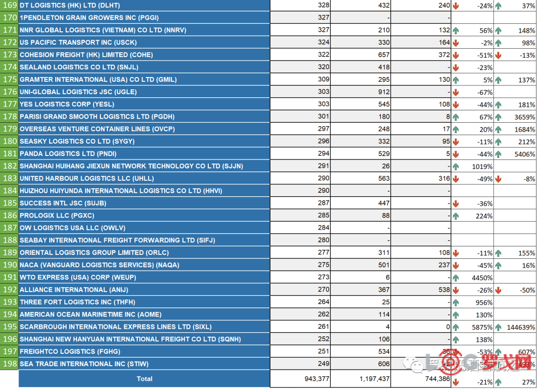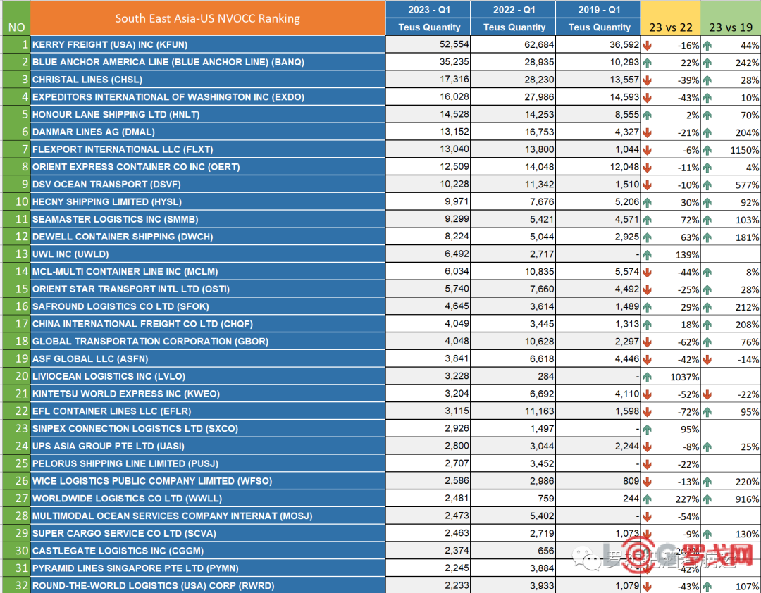 继上篇亚洲美线货代排名(2023 Q1 亚洲美线货代排名)后,皇冠今天来看一下东南亚单独的货代排名。 今年最新的数据显示,东南亚占美国海运总进口量的17%,而且这一比例还在稳步上升。能否尽早在东南亚站稳脚跟并取得飞速发展对美线货代来说至关重要,直接影响公司的未来。 由于美国需求不振,东南亚国家也未能逃脱影响。今年第一季度货量同比下降21%,DG游戏低于亚洲总体水平的26%。跟2019年相比,情况就非常不同了。虽然亚洲整体货量跟2019年持平,东南亚国家的货量却上涨了接近30%,此消彼长的态势显而易见。 排名前200的货代中,117家今年货量同比出现不同程度的下降,欧博注册其中有63家货代的货量有正增长,还有19家货代在2022年的货量为零,可能是全新的公司,也可能启用新SCAC CODE,或者刚开始用自己的合约订舱。一年之内能做进前200这种成功故事在快速发展的东南亚市场不算罕见。跟2019年比,欧博代理只有29几家货代的货量出现下跌,111家货代的货量有增长,而且高达59家货代在2019年的货量为零。令人称奇的是,前200名货代中,有接近三分之一的公司成立的时间还不到五年,欧博官网真的是一派欣欣向荣的景象。换句话说,现在进军东南亚还有机会,因为市场还处在上升期。 跟亚洲的排名一样,Kerry Freight 的货量包含了Apex/Topocean,在东南亚市场,Kerry 的优势更为明显,牢牢占据第一的位置,今年的货量比2019年高出44%。 第二名的KN发展迅猛,今年货量同比不跌反升,跟19年相比更是猛增242%!KN在东南亚取得的长足发展直接推高了公司在亚洲的排名。前10中另外几家欧美的货代也获得了同样惊人的发展,五年的时间里,DHL(第6)货量增长204%,Flexport(第7)则增加1150%,DSV(第9)也不示弱,货量同期激增577%。看到这里,大家肯定留意到一个现象:欧美货代在东南亚市场占尽先机。前10的货代中除了欧美背景的,还有4家港台背景的,他们跟欧美公司一样,早早进驻东南亚市场,多年的耕耘颇有成效。 排名200名的货代第一季度货量在250TEU左右,以此类推,一年货量1000TEU左右就能排进年度前200了。1000TEU 一年貌似不多,特别是对于快速发展的东南亚市场。从排名中可以看出,越南本土的货代规模还没有做起来,对于有超强业务开发能力的中国本土货代,有指定货打底,在东南亚起步未必要从零开始。
