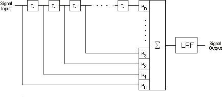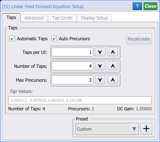 Jitter measurements can be made on the Linear Feedforward Equalizer's output waveform. Before you configure the filter, in the diagram drag an output function color to your filter. This will allow you to simultaneously view the input and output waveforms as you develop your filter. Click on the operator to open the Linear Feed Forward Equalizer Setup dialog. The following figure shows the signal path from the selected input waveform, through the digital equalizer filter and into the displayed output waveform. If you specify that the tap delay tracks the symbol rate, sampling point values in the input array are used directly as equalizer inputs. If a custom tap delay is selected, equalizer input values may be interpolated. By default, Automatic Taps is selected and you can enter the Taps per UI, Number of Taps and Precursors that you want. Tap values are automatically generated. Increasing the number of taps in your model increases the fidelity of the filter's frequency response as compared to an ideal response. Selecting Automatic Taps automatically enters the optimum tap values to open an eye diagram. When Automatic Taps and Auto Precursors you can enter the maximum precursors in the Max Presursors field. When Auto Precursors is cleared, you can specify the exact number of precursors that you want. When Automatic Taps is cleared, you can manually enter a string of filter tap values with each value separated by comma, space, or semicolon character. If the Normalize Gain button is active, click Normalize Gain to automatically adjust the tap values for a maximum equalizer gain of 0 dB (unity). The relative contributions of the tap values are maintained.
