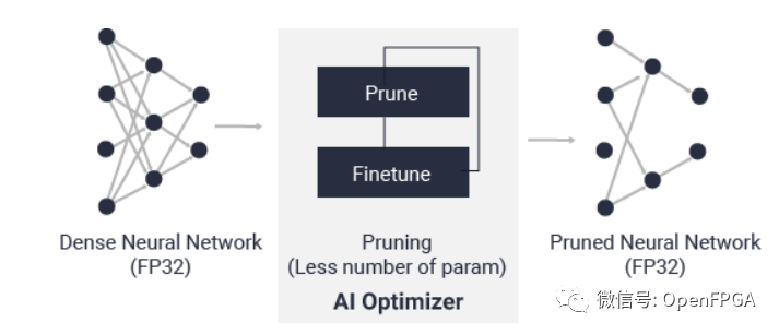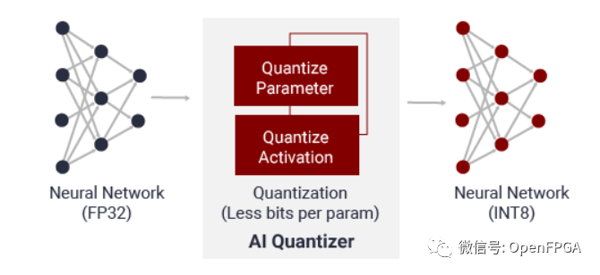 AI 优化器功能简介 这三个作用就是将训练好的模型进行优化,其中AI 优化器是在牺牲很少的精度情况下降模型的复杂度;AI 量化器的作用其实和FPGA的结构有关(FPGA无法处理浮点数据),AI 量化器就是将32 位浮点权值和激活量转换为 INT8 这样的定点数据。