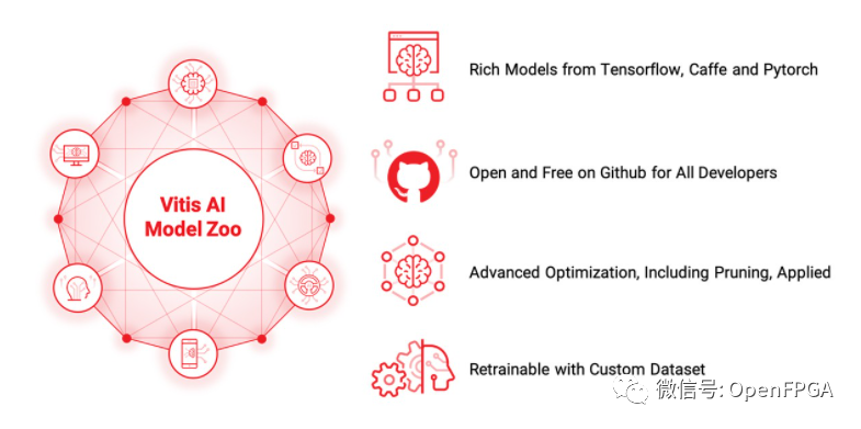 上图就是Vitis AI的整体架构,主要分为AI Model Zoo、AI 优化器、AI 量化器、AI 编译器、AI 配置器、AI 库、XRT、以及核心DPU。 整个流程和上图类似,下面针对每个部分简单介绍(Intel的类似)。 AI Model Zoo