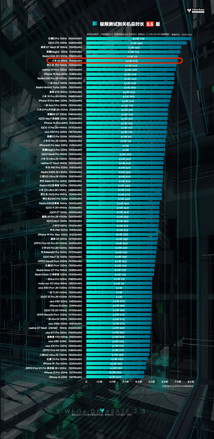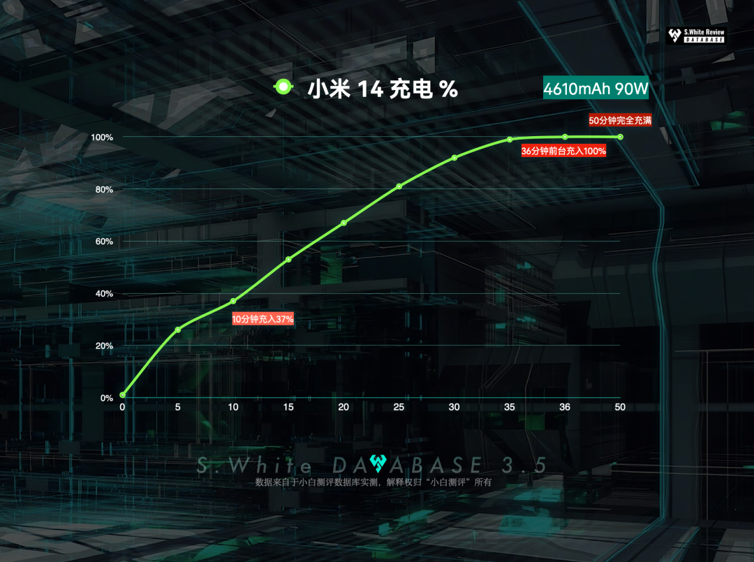 本周小米发布了小米14系列,欧博我们也对小米14系列的续航、充电、性能等进行了测试,本篇汇总「小米14」部分图文版数据,供大家查阅。 实测小米14游戏表现:《星穹铁道》数据库3.5测试平均帧率58.1 FPS,功耗6.1W,皇冠机身最高温度46.9℃;《原神》数据库3.5测试平均帧率60 FPS,功耗5W,机身最高温度44.2℃;《王者荣耀》120帧高清画质:平均帧率119.9 FPS,功耗3.1W,DG游戏机身最高温度40.2℃。(环境温25℃±0.5℃,屏幕亮度350nit,声音50%,性能模式) 实测小米14充电表现:4610mAh电池容量,欧博注册90W充电功率,25℃环境中峰值功率70W,10分钟充入电量37%,36分钟前台充入100%(实际充入电量94.02%),欧博代理50分钟完全充满。 实测小米14续航表现:4610mAh电池容量,1.5K屏幕分辨率,120Hz刷新率,三小时轻度续航测试剩余电量65%; 五小时重度续航测试剩余18%,极限续航测试直到关机,小米14共坚持6小时57分。 以上均基于小白测评数据库模型测试,环境温25℃±0.5℃,屏幕亮度350nit,声音50%(5小时重度续航、极限续航测试:性能模式)(数据基于小米14测试时最新版 Xiaomi HyperOS 1.0.6.UNCCNXM 系统测试)。 最后例行强调:续航模型为较高强度连续测试,每个用户的使用习惯不同,小白测评数据库尽可能同一变量、用固定模型统一测试(前3小时为插卡WiFi下测试、三小时后使用流量测试),为大家提供参考。具体用户实际使用表现视个人习惯而定。关于小白测评数据库测试模型细节可以在微信公众号后台回复「数据库测试手册」进行查阅,感兴趣也可自行复测,更多新机实测数据及部分机型复测数据,小程序均会首发更新,所有数据以小程序为准,大家可进入小白测评数据库 收藏并免费查看。