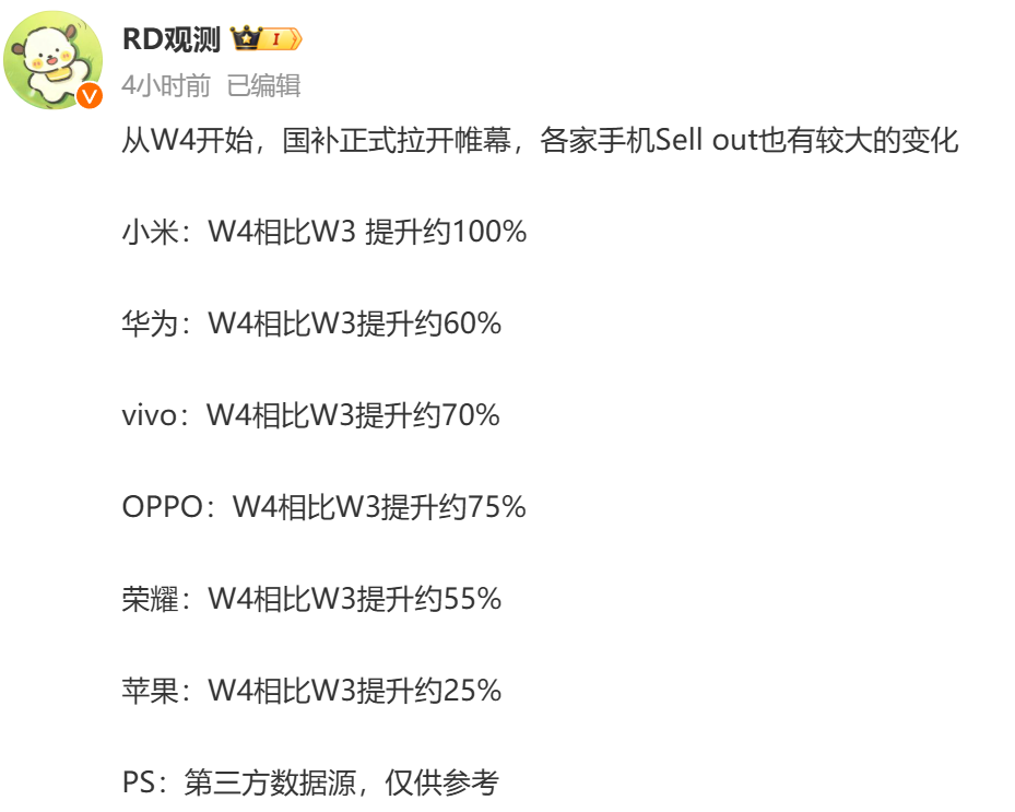 自从新一轮的手机国补正式开启后。 果然,DG游戏最近的手机市场又双叒叕迎来了一波销量高峰。 根据央视新闻发布的消息。 截至 26 号,全国就有近 800 万消费者申请了超过 1000 万件的数码补贴。 具体到各家厂商上。 也有博主爆料说。 其中小米在第四周的份额提升最为明显,欧博注册达到了 100%。 结合此前消息看,阿米在这波国补中的出货主力,欧博代理还是真正的性价比扛把子——红米 K80。 作为一台搭载骁龙8Gen3、2K华星M9直屏、超声波指纹、6550mAh电池+90W快充、IP68防尘防水、光影猎人800主摄的新机子。 K80 现在使用国补后的起售价,已经来到了 2124 元。 包括之前很热门的 12GB+512GB 版本,欧博官网现在也能以低于 2500 的价格拿下。 该说不说,确实很香,欧博娱乐甚至有点 618 提前了的感觉。 如果机友们最近有入手这个价位新机的打算。 建议重点关注一下这台。