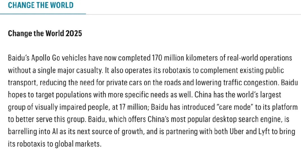 撰文丨何己派 25岁的百度,DG游戏仍是那个满怀技术理想主义的百度。 9月24日,《财富》杂志公布2025年“改变世界”公司榜单,百度凭借萝卜快跑在自动驾驶领域的影响力与安全性入选,代表中国力量,步入聚光灯下。 这已是其继2019年之后,第二次上榜。 今年以来,萝卜快跑出海明显提速。在拿到迪拜自动驾驶“001车牌”之后,又有最新消息称,萝卜快跑的全球布局将扩展至澳大利亚和东南亚地区。其社会价值和商业价值的双赢,悄然复制到更多的海外市场。 随着全球AI浪潮向纵深发展,百度的AI出海战略,也在显现新的气象。 尊重“改变”的价值 要理解百度这次上榜的意义,先得从《财富》杂志设立的榜单说起。 “改变世界”榜单已连续公布11年,其设立的出发点,在于表彰那些通过执行核心业务战略,在社会责任和公共利益层面,欧博注册贡献突出的公司。 每年,编辑部会从⼤约250家候选公司中,遴选出50余家佼佼者,评估的重点因素,主要是三个方面,可衡量的社会影响、经营业绩以及创新水平。 尤其社会影响力,其内涵包括共享价值、生态价值等多个维度,可以是某一个或多个特定社会问题所产生的影响,《财富》会评估这种影响的范围、性质和持续时间。 从《财富》对萝卜快跑的评语里,能看到其获入选的落点,放在“改变出行文明”上。 “萝⼘快跑⽬前已完成2亿公⾥的真实道路运营,且未发⽣过任何⼀起重⼤事故。百度还通过布局Robotaxi,实现对现有公共交通体系的补充,从⽽缓解交通拥堵。”编辑部介绍称。 同时,百度还希望进一步服务“视障人士”等特定需求人群,在平台上推出了“关怀模式”。 此外,欧博代理百度的AI叙事和全球谋划,也被提及。 “百度正⼤举进军⼈⼯智能领域,作为其下⼀步增⻓动⼒,萝⼘快跑已与Uber和Lyft 展开合作,计划将其Robotaxi推⼴⾄全球市场。”《财富》官⽹写道。 所有将“改变世界”作为发展重要指针的企业,都值得一个褒奖。对百度而言,无论外界如何看,它都切实地将创新的力量,融入到“帮助人们成长”的愿景里,并一以贯之。 就在这次上榜引发关注的4个多月前,百度创始人李彦宏,在一次内部颁奖活动里,分享了这样一件小事: 他在武汉参加Create2025大会并搭乘萝卜快跑,有路过的参会者摇下车窗,对他搭乘的萝卜快跑喊道,“百度牛!百度牛!” “看到一辆车在那么拥挤的道路上,欧博官网能完全没有人地开起来,还是挺震撼的。” 当时的演讲,他意味深长地引用了乔布斯的那句名言,“只有疯狂到以为自己能改变世界的人,才能真正改变世界”。 他对百度人有信心,“我们一定可以改变这个世界。” 萝卜,在出圈快跑 萝卜快跑,让百度“改变世界”的价值被看到,同时愈发展现积极出海的锐气。 9月24日,《财富》榜单公布的同一时间,远在迪拜的朱美拉海滩公路上,数十辆萝卜快跑载着参会嘉宾,驶向“迪拜世界自动驾驶交通大会”。 这个小型车队,是持牌上岗——头顶迪拜首个自动驾驶测试牌照,001号车牌。 很难想象,2月,欧博娱乐李彦宏在迪拜WGS大会上与阿联酋AI部长奥马尔·苏丹·奥拉马对谈时,部长聊的展望是明年,他期待“明年大会上,所有车队都是由萝卜快跑支持的无人驾驶。” 不过半年时间,萝卜快跑第六代无人车组成的车队,已成为“迪拜世界自动驾驶交通大会”的唯一试乘车队,正式提供无人驾驶出行服务,充分看出迪拜官方的认可。 在迪拜,萝卜快跑的落地速度,可谓一路飞驰。 7月,迪拜道路和交通管理局(RTA),为其颁发首批50个自动驾驶测试牌照。 根据今年3月签署的合作协议,萝卜快跑将在迪拜,率先部署超1000台全无人驾驶汽车,完成规模化落地。 过去十余年里,百度团队投入大量资源进行技术研发和测试,从国内真实、复杂的出行场景里,积攒高质量训练数据和丰富经验,所打下的夯实基础,蓄势待发,已到推向全球的绝佳时机。 这背后,当然离不开技术实力的支撑。 以迪拜为例,当地有着密集环岛、高速并道等复杂路况,萝卜快跑所表现出的类人化的流畅驾驶能力,以及耐高温、抗沙尘的硬核技术,顶住了中东极端气候考验。 目前,萝卜快跑已驶入香港、迪拜、阿布扎比等16座城市,累计在全球提供超1400万次无人驾驶出行服务。 7月以来,萝卜快跑与Uber、Lyft等全球平台合作,按规划,将进一步加速在中东、欧亚等地区的布局。另据相关媒体报道,百度正探索将萝卜快跑的全球布局,扩展至澳大利亚及东南亚。 一个中企科技出海新样本,雏形已成。 架设出海新栈道 包括萝卜快跑在内,今年以来,百度的多条业务线,频繁有出海新动向。 9月22日,百度网盘宣布,⽹盘海外版在移动端全⾯开放海外⼿机号注册,并针对海外华人、留学生等海外用户,进行AI功能全新升级。 作为一款国民级App,将海外用户纳入版图的决定,绝对是经过深思熟虑的,后续或将有新的产品打法。 再看To B这边,7月,百度智能云与香港大学达成深度合作,紧盯“AI教育+技术实践”的双轮驱动,迈开出海关键一步。 这一合作的背景在于,Al for Science快速崛起,成为全球科研新范式,AI在驱动科学发现、提升科学实验水平、加速跨学科融合等方面,具有重要意义。 作为在“算力-框架-模型-应用”这四个方面层层布局的AI公司,百度既手握扎实的基础创新,又持续推动前沿的应用落地,如此双轮驱动,充分有机会在Al for Science领域,率先找到突破口,为自身业