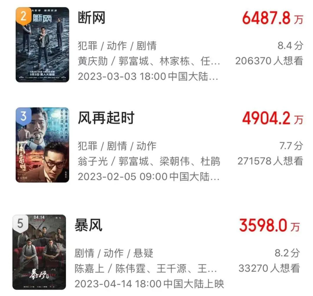 今年五一档,香港导演彭顺的《惊天救援》与麦兆辉的《检察风云》表现都不及预期。一直以来,犯罪、悬疑、动作、灾难片,都是香港导演的拿手好戏,这种商业类型片扮演着很重要的冷档期调节器作用。 而且硬糖君此前也盘点过(《消失的香港导演》),疫情三年,香港导演手上积压了很多影片没上。但从目前上映的积压片来看,这些港片导演的“行活”,票房是越来越卖不动了。比如,郭富城、林家栋主演的《断网》,陈伟霆、王千源的《暴风》,以及郭富城、梁朝伟的《风再起时》,票房均没有过亿。 雪上加霜的是,影片的宣发也不合时宜。《惊天救援》在北大做校园点映时,还闹出负面舆论。传闻有大学生当场指出影片存在不合逻辑之处,随后被片方找麻烦。虽然又被片方辟谣,但仍然引发了舆论危机。 不难从影片的评论中看出,这些香港导演的行活类型片,整体呈现出一种老套陈旧感,仍是在复刻十几年前的老港片。这类型影片还去做高校点映,明显是找错受众了。甭管你是送温暖去工厂还是送温暖去大厂,都比找压根没经历过90年代港片洗礼的00后大学生靠谱些。