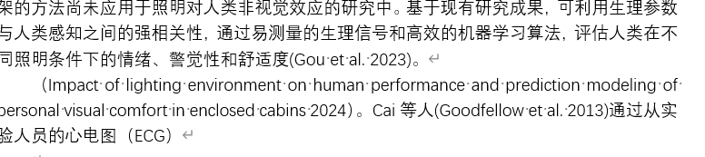 即所有部分全部是蓝色,可以用以下域代码 Sub CitingColor() For i = 1 To ActiveDocument.Fields.Count '遍历文档所有域 ' Word 自带的交叉引用的域代码起始 4 位是 " REF" (注意空格) ' 插入的引用域代码的起始 14 位是 " ADDIN EN.CITE" ' Zotero 插入的引用域代码的起始 31 位是 " ADDIN ZOTERO_ITEM ",可根据需求添加其他类型 If Left(ActiveDocument.Fields(i).Code, 4) = " REF" Or Left(ActiveDocument.Fields(i).Code, 14) = " ADDIN EN.CITE" Or Left(ActiveDocument.Fields(i).Code, 31) = " ADDIN ZOTERO_ITEM CSL_CITATION" Then ActiveDocument.Fields(i).Select ' 选中上述几类域 Selection.Font.Color = wdColorBlue ' 设置字体颜色为蓝色,可改为其他颜色,如 RGB(255,0,0) End If Next End Sub使用方法和之前的一样 如果发现以上宏不能应用的话,本人发现先应用只数字部分变为蓝色的宏片段,再使用前面的所有部分所有引用内容变为蓝色的话会出现无法修改的情况,因此使用进一步修改了宏片段: Sub HighlightCitationNumbersEnhanced() Dim fld As Field Dim originalRng As Range Dim fieldCount As Integer Dim doc As Document Set doc = ActiveDocument Set originalRng = Selection.Range fieldCount = 0 Application.ScreenUpdating = False ' 检查文档是否有域 If doc.Fields.Count = 0 Then MsgBox "文档中没有找到任何域。", vbInformation Exit Sub End If For Each fld In doc.Fields On Error GoTo NextField ' 错误处理 Dim codeText As String codeText = fld.Code.Text ' 更宽松的匹配条件,适应各种引用格式[1,2](@ref) If InStr(codeText, "REF") > 0 Or _ InStr(codeText, "CITE") > 0 Or _ InStr(codeText, "ZOTERO") > 0 Or _ InStr(codeText, "BIBLIOGRAPHY") > 0 Then ' 设置整个引用结果为蓝色[3](@ref) fld.Result.Font.Color = wdColorBlue fieldCount = fieldCount + 1 End If NextField: Next fld Application.ScreenUpdating = True originalRng.Select MsgBox "成功为 " & fieldCount & " 个引用设置蓝色字体颜色。", vbInformation End Sub这样一定能将从endnote、zetore引用的部分变为蓝色 如下
