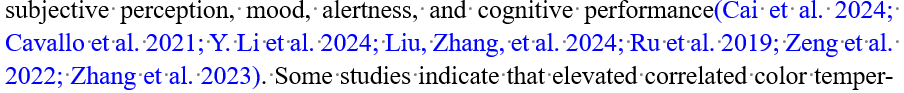上面的代码会将[]一起变为蓝色,如果只想要里面的内容变为蓝色,那么可以先运行第一段代码: Sub HighlightCitationNumbersEnhanced() Dim fld As Field Dim originalRng As Range Dim fieldCount As Integer Dim doc As Document Set doc = ActiveDocument Set originalRng = Selection.Range fieldCount = 0 Application.ScreenUpdating = False If doc.Fields.Count = 0 Then MsgBox "文档中没有找到任何域。", vbInformation Exit Sub End If For Each fld In doc.Fields On Error GoTo NextField Dim codeText As String codeText = fld.Code.Text If InStr(codeText, "REF") > 0 Or _ InStr(codeText, "CITE") > 0 Or _ InStr(codeText, "ZOTERO") > 0 Or _ InStr(codeText, "BIBLIOGRAPHY") > 0 Then Dim searchRange As Range Dim startRange As Range Dim endRange As Range Dim contentRange As Range Set searchRange = fld.Result.Duplicate ' 查找 '[' With searchRange.Find .Text = "[" .Forward = True .Wrap = wdFindStop If .Execute Then Set startRange = searchRange.Duplicate ' 从 '[' 之后查找 ']' Set endRange = startRange.Duplicate endRange.Start = startRange.End endRange.End = fld.Result.End With endRange.Find .Text = "]" .Forward = True .Wrap = wdFindStop If .Execute Then ' 精确定位方括号内的内容(不包含[]) Set contentRange = fld.Result.Duplicate contentRange.Start = startRange.End ' 从 '[' 之后开始 contentRange.End = endRange.Start ' 到 ']' 之前结束 contentRange.Font.Color = wdColorBlue fieldCount = fieldCount + 1 End If End With End If End With End If NextField: Next fld Application.ScreenUpdating = True originalRng.Select MsgBox "成功为 " & fieldCount & " 个引用设置蓝色字体颜色。", vbInformation End Sub再运行第二段代码即可,用下面的宏代码运行即可 Sub HighlightCitationNumbersEnhanced() Dim fld As Field Dim originalRng As Range Dim fieldCount As Integer Dim doc As Document Set doc = ActiveDocument Set originalRng = Selection.Range fieldCount = 0 Application.ScreenUpdating = False If doc.Fields.Count = 0 Then MsgBox "文档中没有找到任何域。", vbInformation Exit Sub End If For Each fld In doc.Fields On Error GoTo NextField Dim codeText As String codeText = fld.Code.Text If InStr(codeText, "REF") > 0 Or _ InStr(codeText, "CITE") > 0 Or _ InStr(codeText, "ZOTERO") > 0 Or _ InStr(codeText, "BIBLIOGRAPHY") > 0 Then Dim searchRange As Range Dim startRange As Range Dim endRange As Range Dim contentRange As Range Set searchRange = fld.Result.Duplicate ' 查找 '[' With searchRange.Find .Text = "[" .Forward = True .Wrap = wdFindStop If .Execute Then Set startRange = searchRange.Duplicate ' 从 '[' 之后查找 ']' Set endRange = startRange.Duplicate endRange.Start = startRange.End endRange.End = fld.Result.End With endRange.Find .Text = "]" .Forward = True .Wrap = wdFindStop If .Execute Then ' 精确定位方括号内的内容(不包含[]) Set contentRange = fld.Result.Duplicate contentRange.Start = startRange.End ' 从 '[' 之后开始 contentRange.End = endRange.Start ' 到 ']' 之前结束 contentRange.Font.Color = wdColorBlue fieldCount = fieldCount + 1 End If End With End If End With End If NextField: Next fld Application.ScreenUpdating = True originalRng.Select MsgBox "成功为 " & fieldCount & " 个引用设置蓝色字体颜色。", vbInformation End Sub最终格式如下: