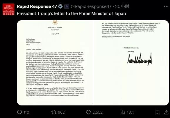 白宫公布特朗普致日本等14国关税信函 推文截图 不过,并非所有亚洲官员都表达了同样的愤怒程度。一些人对最新威胁只是耸了耸肩,认为这只是特朗普式的政治表演。还有人将特朗普的声明视为将谈判时间延长三周,至8月1日。一名外交官表示:“这只是姿态,没有具体内容。谈判仍在进行中。美国在施压我们接受它的条件。” 尽管如此,这些国家的官员一致否认了他们在与特朗普政府的谈判中没有足够积极参与的说法。 报道称,自从特朗普在4月提出“对等”关税威胁以来,日本和韩国一直与特朗普的首席谈判代表定期会晤,但谈判因国防开支、汽车和农业问题陷入僵局。其他较小的国家,如马来西亚和泰国,一直在积极寻求深化谈判,并提出购买更多美国商品以示善意。 “我们不应抱怨特朗普的反复无常,现在是我们加强自身的时候了,”前泰国外长卡西特·皮罗米亚向Politico表示,“所以我们(东盟)暂时可能要忘记外部市场,尤其是美国,重新组织起来。” “特朗普的关税将把亚洲国家推向中国” 尽管引起了强烈反对,截至目前,特朗普尚未缓和言辞。他在8日的内阁会议上表示,美国希望与各国保持关系,“但在每一种情况下,他们对我们的待遇远比我对他们的待遇糟糕”。 白宫将发送信函的决定框定为促使所联系国家进行“有意义接触”的一种手段。一名白宫官员表示:“我们在这里有优势。但我们还没有从日本和韩国收到认真的提议,这就是为什么我们还没有与它们达成协议。”