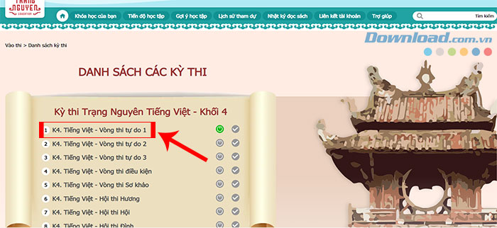 Bước 2: Tại Danh sách các kỳ thi, nhấn vào một bài thi có sẵn, ví dụ K4. Tiếng Việt - Vòng thi tự do 1 (biểu tượng kích hoạt màu xanh lá cây).