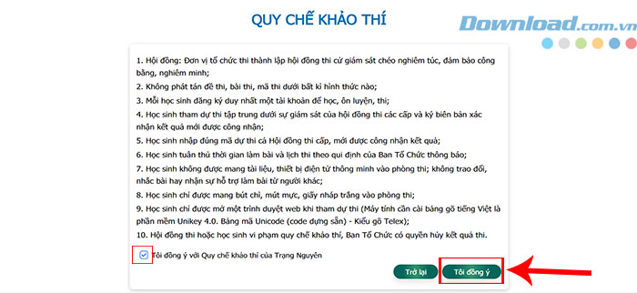 Bước 3: Đọc kỹ toàn bộ Quy chế khảo thí để nắm rõ quy định của cuộc thi. Sau đó, tích vào ô Tôi đồng ý với Quy chế Khảo thí và nhấn nút Tôi đồng ý.