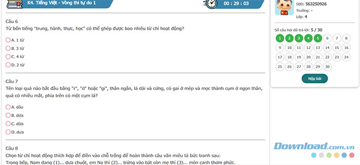 Bước 4: Bắt đầu làm bài thi trắc nghiệm, chọn 1 đáp án đúng duy nhất từ 4 đáp án được cung cấp. Học sinh cần trả lời toàn bộ 30 câu hỏi trong vòng 30 phút. Câu hỏi đã chọn đáp án sẽ có màu xanh, để di chuyển tới 1 câu bất kỳ, học sinh chỉ cần nhấn vào số thứ tự câu đó.