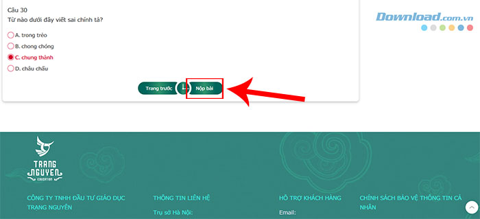 Bước 5: Sau khi hoàn thành bài thi, các em cần nhấn nút Nộp bài ở cuối cùng của bài thi hoặc tại khu vực hiển thị Số câu hỏi đã trả lời.