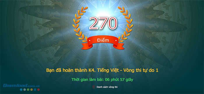 Bước 7: Một thông báo hoàn thành kỳ thi cùng với số điểm đạt được và thời gian làm bài sẽ hiển thị. Như vậy, các em học sinh đã hoàn thành vòng thi tự do của Trạng Nguyên Tiếng Việt 2023-2024.